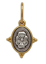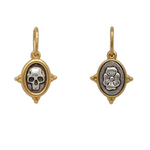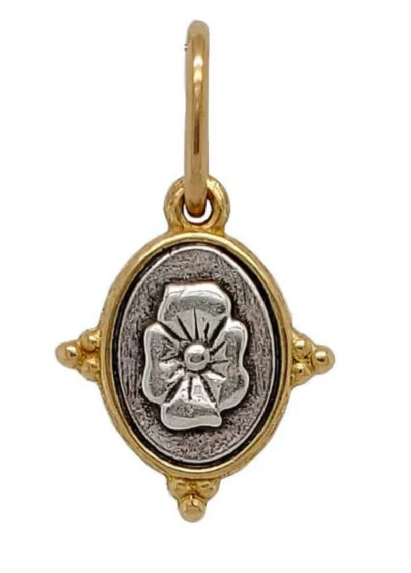Part of our collection of iconic charms by Erica Molinari! An Oxidized Sterling Silver oval-shaped charm is rimmed in 18k Yellow Gold with added gold bead detailing at 3 points. The two-sided charm is crafted with a skull design on one side and a single flower on the other. A gorgeous addition to any necklace or charm bracelet!