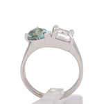 A two-stone ring that will have you swooning! One-of-a-kind by Kristin Novinger, this 14k White Gold ring features two prong-set stones, one Radiant Cut Diamond and one Pear Cut Tourmaline that angles towards the diamond, giving a unique design to the piece. The thick, high-polished band tapers down towards the base of the finger for maxmimum comfort. A unique, sparkling piece sure to turn heads!