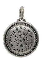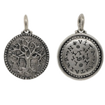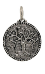 One of our favorite charms by Erica Molinari! A large Sterling Silver circular charm with an oxidized finish features a large tree design on one side while the other reads "Life I/s Changed Not Taken Away" in circular Italian script. The charm features a beaded edge and circular bail to easily be slid onto your favorite chains.