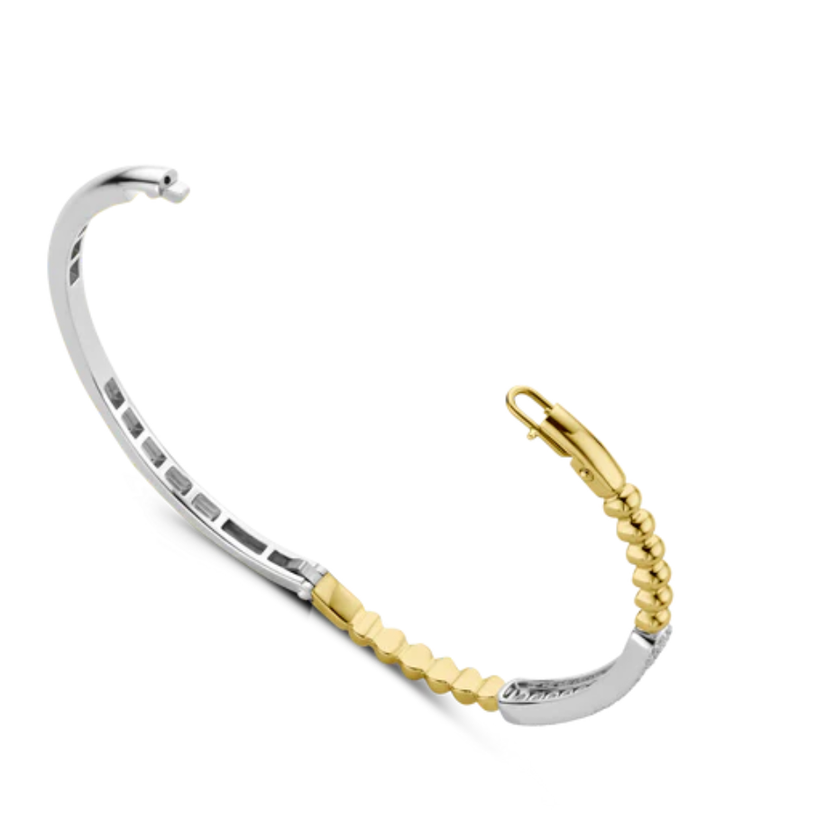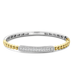The sparkle in this mixed-metal TI SENTO-Milano piece is beautiful! The top of the wrist is adorned with a row of white Zirconia stones surrounded by smaller stones all set in Sterling Silver. Each side of the bracelet is crafted with gold plated bubble sections that lead back to a high polished silver bottom. With a hidden hinge clasp for easy, secure wear - this is perfect alone or layered with your other favorite bracelets!