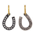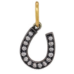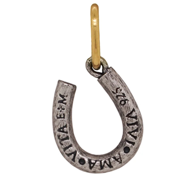 Part of our collection of iconic charms by Erica Molinari, this piece immediately became a staff favorite! A sterling silver horseshoe shape with an oxidized finish is set along the front with round white diamonds. The backside of the charm features a blackened engraved phrase, which translates to "love my life."