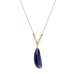 Dana Kellin has us drooling over this new one-of-a-kind necklace! Featuring a long, asymmetrical Blue Sapphire that is accented by a row of Gray Diamonds wire-wrapped by hand to the pendant in 14k Yellow Gold wire. The pendant connects to a unique open-link style chain which leads up to a long cable chain, both 14k Yellow Gold. Truly a breathtaking piece!