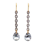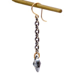 Each earring features a "platinum" colored crystal drop that is wire-wrapped with gold filled wire to the base of a chunky Oxidized Sterling Silver chain drop. A classic shepherds hook allows the drops to move as you do, catching the light and bringing a beautiful sparkle to your look!