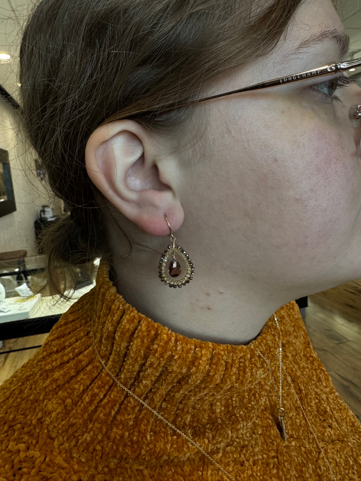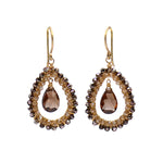 Unique, neutral drops that pack some serious sparkle! Dana Kellin made each of these earrings with a single, faceted, pear-shaped Smokey Zircon drop that hangs in the center of a gold-filled frame. The frame is wire wrapped with faceted white crystals and a second row of dark brown crystals. The earrings are finished with a classic shepherds hook.