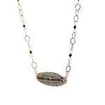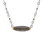 From Dana Kellin's Fine Jewelry Collection! A long oval disc pendant with a diamond cut outer edge is pavé set with round natural Daimonds. The pendant features a row of sparking Black Spinel that runs horizontally through the center. Each end of the pendant is wire-wrapped by hand with 14k Yellow Gold wire to a unique open-link Oxidized Sterling Silver chain with stations of wire-wrapped Black Spinel gems.