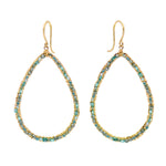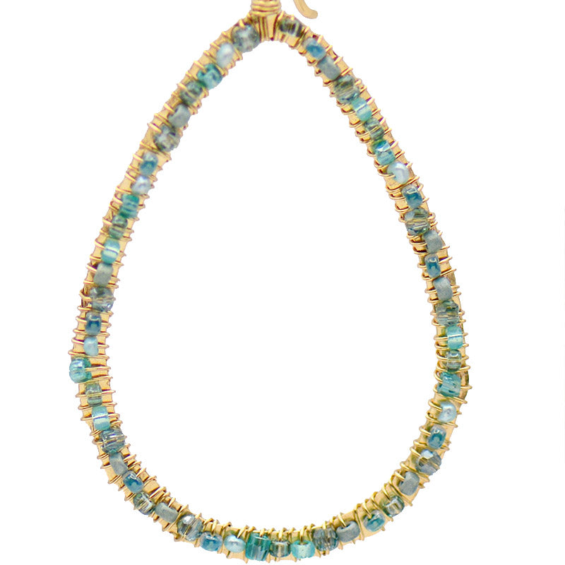 Various shades of light blue and light green crystals are wire-wrapped by hang onto a large, open pear-shaped drop. The yellow gold filled earrings are the perfect example of the beautiful craftsmanship we've come to expect from Dana Kellin's pieces. Hanging from a classic shepherds hook, you'll love this unique pair you can wear all day long!