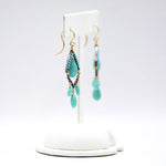 You've never seen Chandelier earrings quite like this! Dana Kellin designed each earring with a pear-shaped Turquoise drop that hangs inside of a v-shaped drop adorned with round Turquoise stones. The "v" connects to an Oxidized Sterling Silver chain link drop that holds 3 more Turquoise, coming to a point at the base of the earring. Each gem is wire-wrapped by hand, a signature of the designer's work. Hanging form a 14k gold-filled shepherds hook, you'll love the movement these bring!