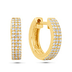 You've never seen diamond huggies like this! 3 rows of round, white natural diamonds are set along the front half of a thick, 14k Yellow Gold hinged hoop. The earring features a locking post for secure, comfortable wear! They sit close to the ear lobe and pack the sparkle!! One of our favorite pairs of earrings.