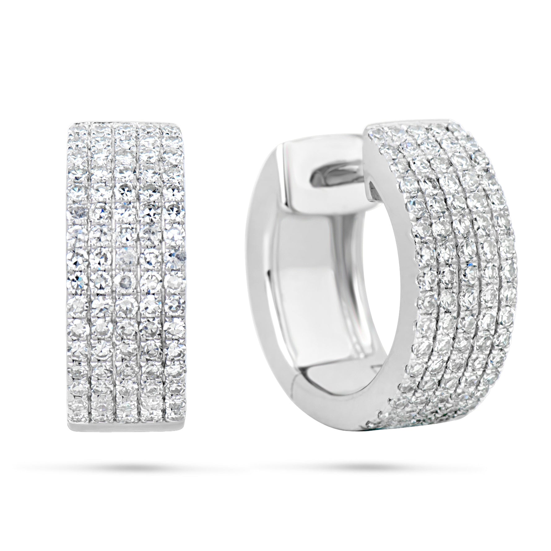 You've never seen diamond huggies like this! 5 rows of round, white natural diamonds are set along the front half of a thick, hinged hoop. The earring features a locking post for secure, comfortable wear! They sit close to the ear lobe and pack the sparkle!! One of our favorite pairs of earrings.