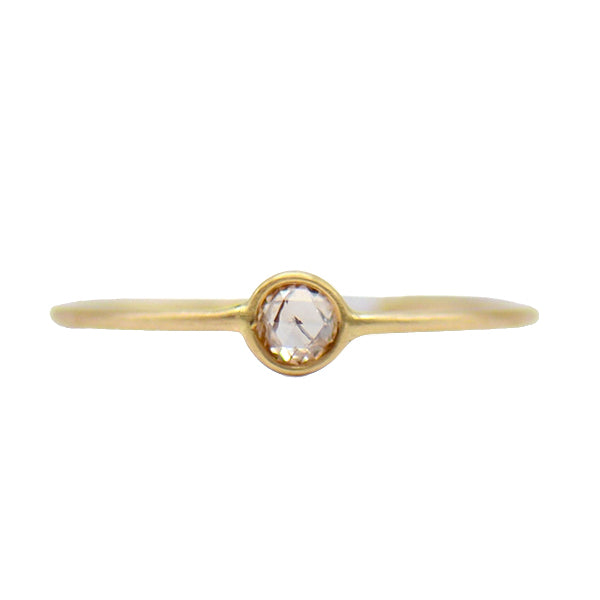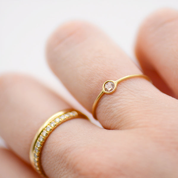 This dainty beauty by Margaret Solow is a great addition to your stack or to wear alone! A small, round, faceted Diamond is wrapped in a 14k Yellow Gold bezel that leads down to a 14k Yellow Gold solid band. A favorite around here!