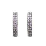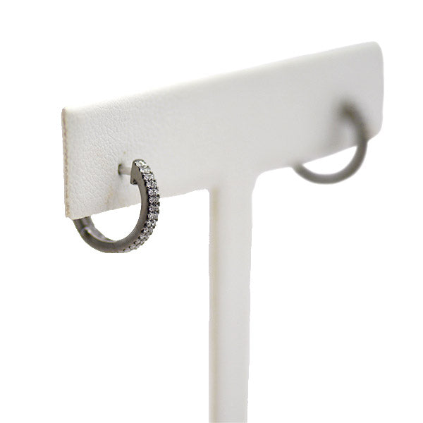 2 rows of round, white diamonds are set along the front of these huggie hoop earrings by Dilamani! The hoops are crafted in 14k White Gold with a blackened finish that contrasts the diamonds beautifully. Unique, sparkling, and equipped with a click closure that will give you secure, all-day wear!