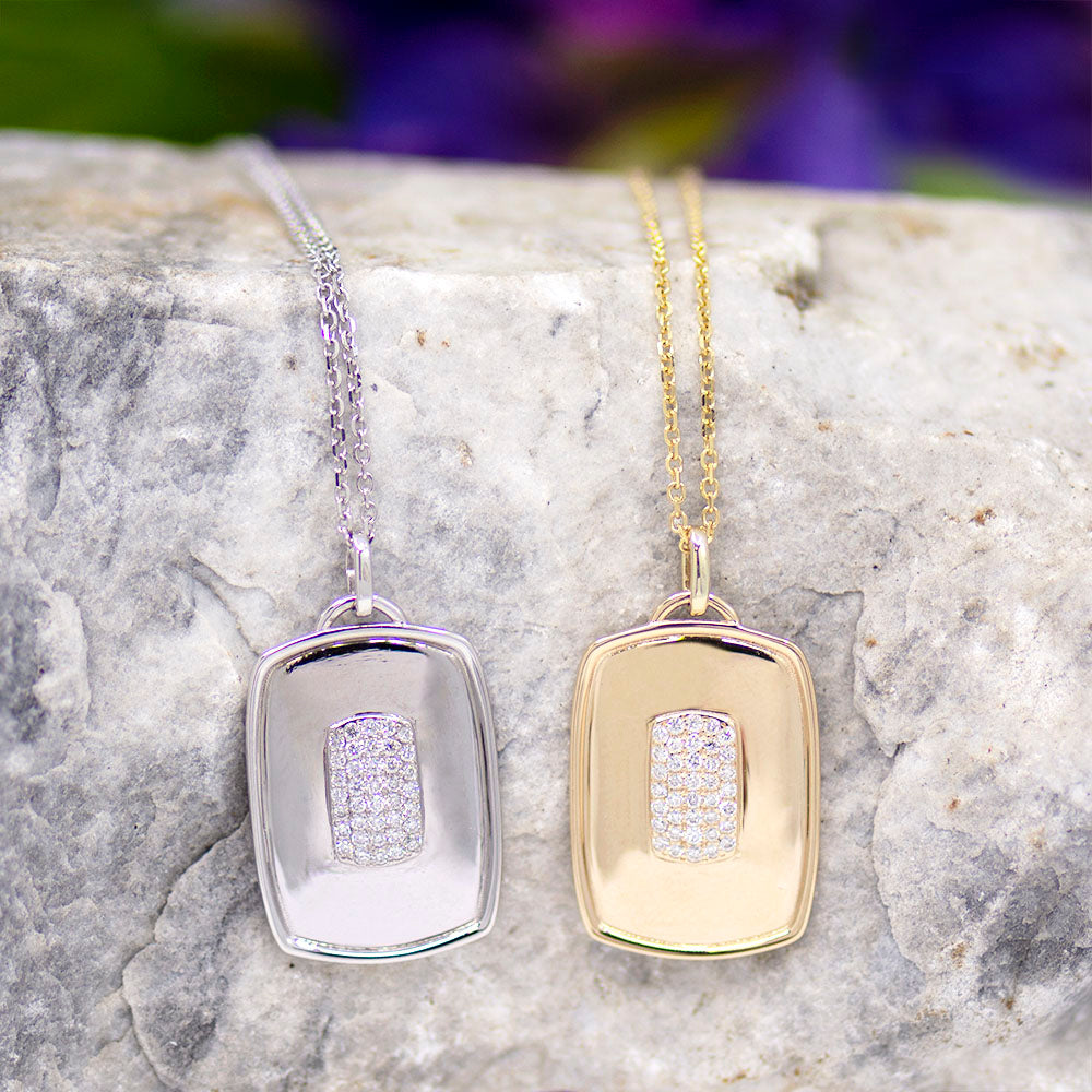 WOW! Kristin Novinger has taken the trendy dog-tag style pendants and made a sparkly dream! Each necklace (available in 14k White or Yellow Gold) features a cushion-shaped pendant with a high polish finish. In the center of each pendant is a raised section of pave set round diamonds, bringing a stunning sparkle to the design. Hanging from an adjustable chain, they're perfect for a bold layered look!