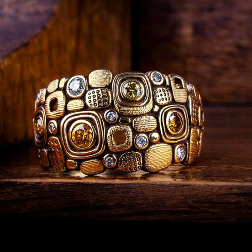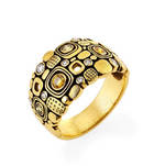The negative space & natural diamonds make this Alex Sepkus piece so unique! Along the top half of the ring, different shapes (some solid and some open) of 18k yellow gold are adorned with a textured finish. In the center of a few of the squares are bezel set with natural colored diamonds that have gorgeous warm and earthy hues. In between the various square and rectangular shapes are bezel set round brilliant cut diamonds giving some extra sparkle to this tapered ring!