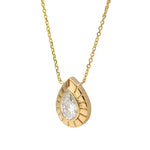 A sparkling diamond necklace by Kristin Novinger that will leave you in awe! A natural pear-cut diamond is set, slightly elevated, in a 14k Yellow Gold bezel. The bezel leads down to a high-polished extended halo of 14k Yellow Gold that features grooved detailing. An impressive necklace to wear on any occasion!