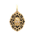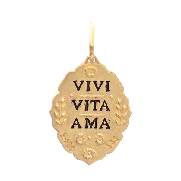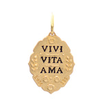 This gold double-sided charm by Erica Molinari features the most gorgeous hand-painted black enamel design around a raised skull on one side. The skull is set at the eyes with round diamonds for a touch of sparkle! The opposite side is hand-painted with a black enamel phrase which translates to "live, llife, love." Unique, intricate, and beautiful with a scalloped edge design and classic oval bail.