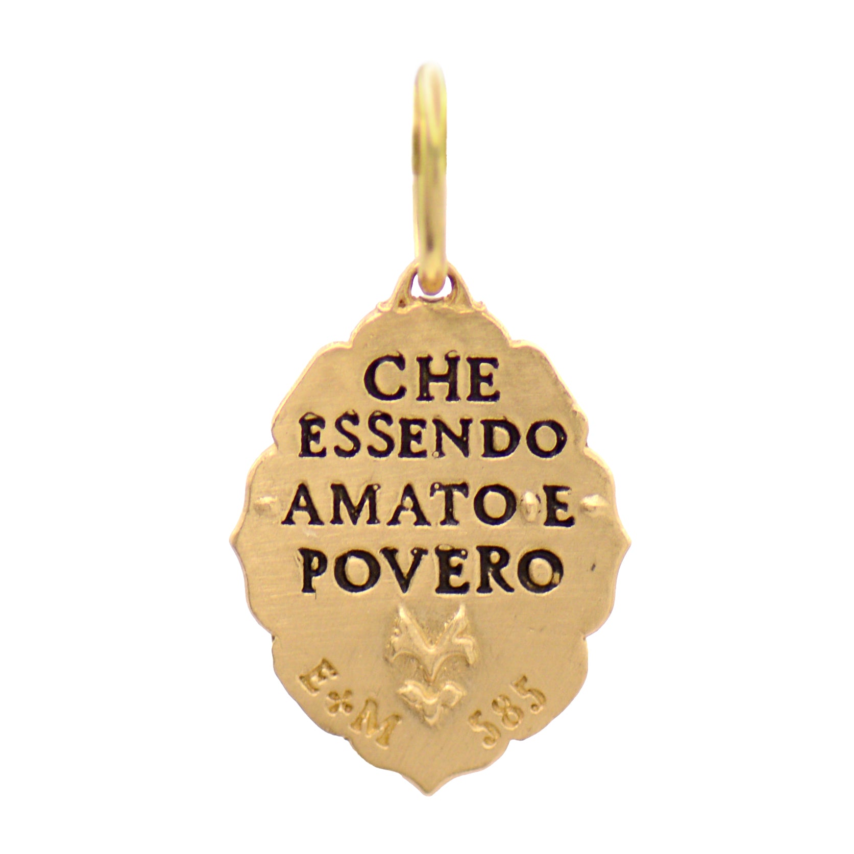 This gold double-sided charm by Erica Molinari features the most gorgeous hand-painted black enamel design around a raised hummingbird on one side. The opposite side is hand-painted with a black enamel phrase which translates to "who, being loved, is poor?" Unique, intricate, and beautiful with a scalloped edge design and classic oval bail.