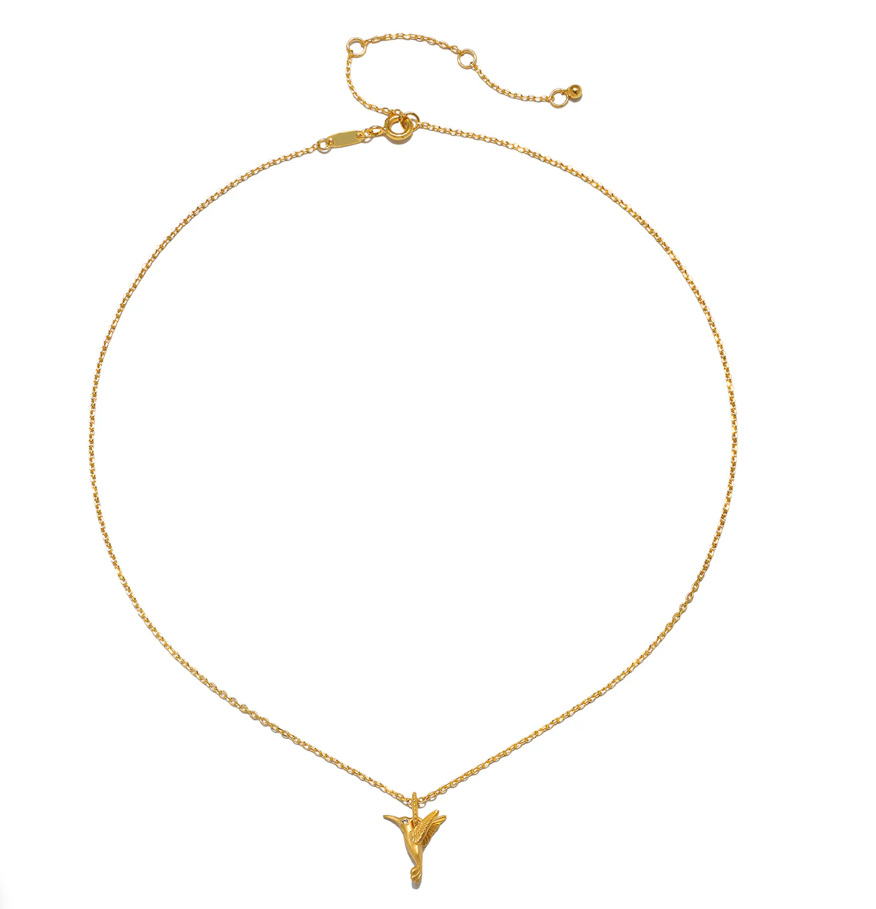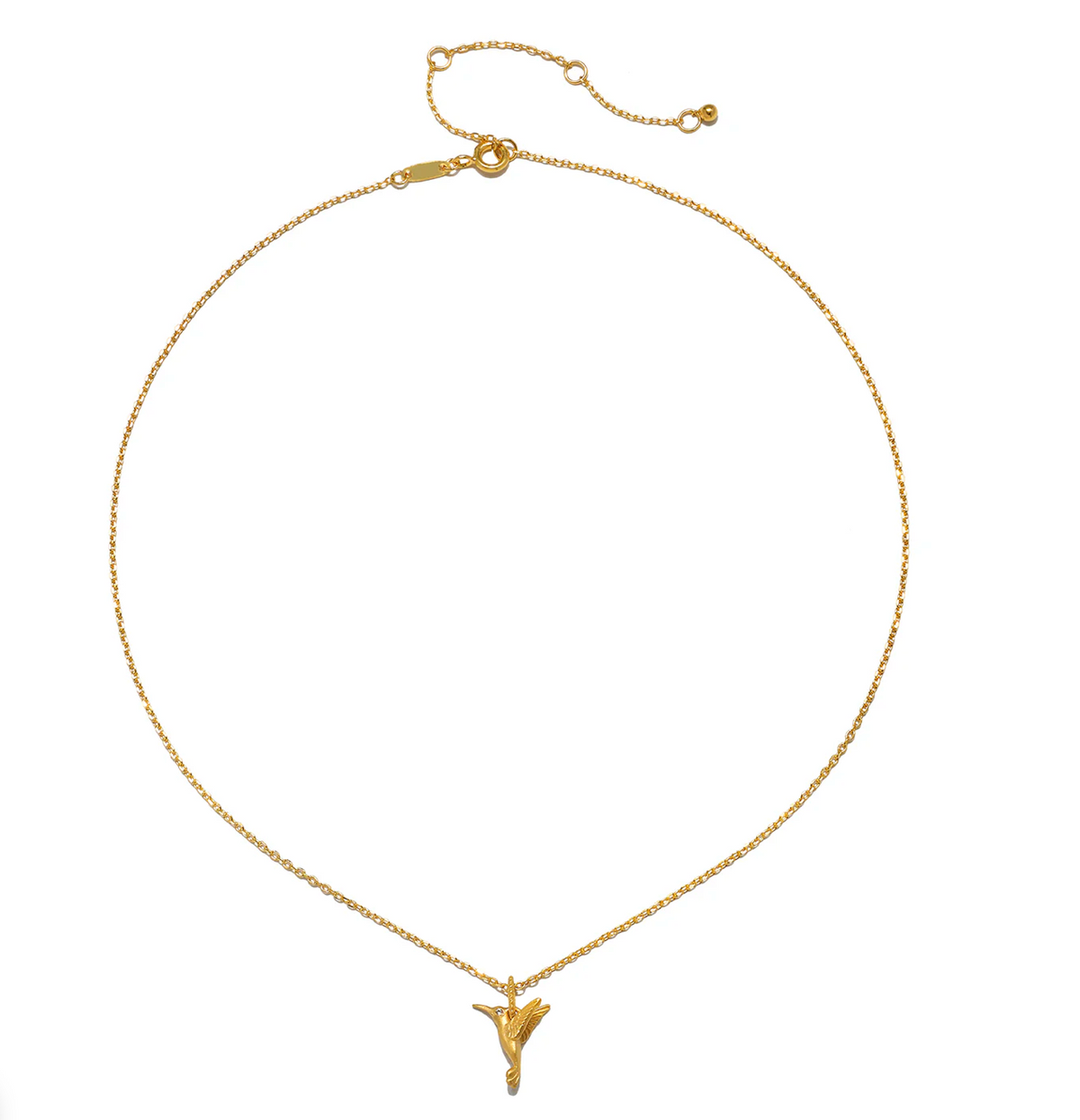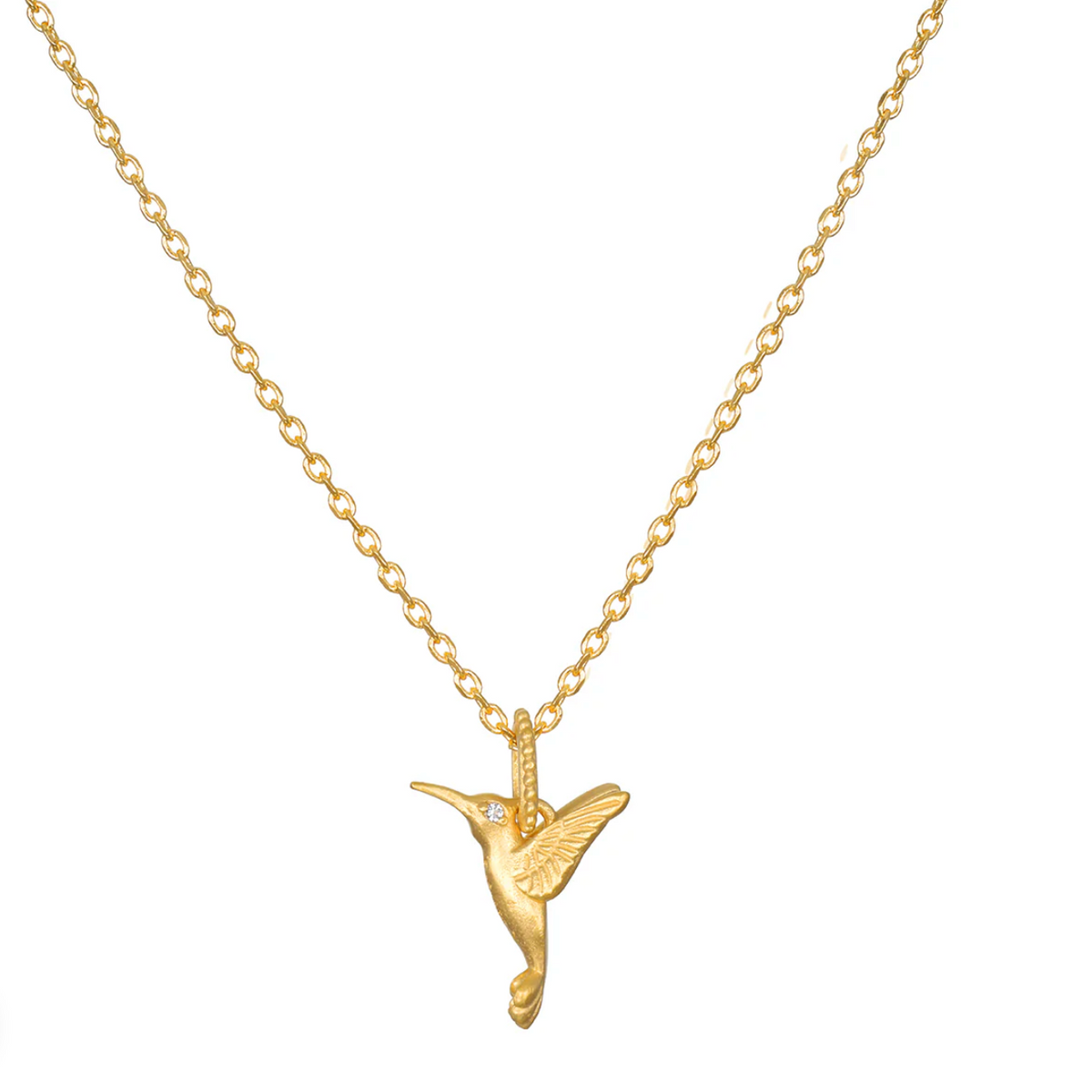 With loving devotion, our spirits take flight; we transform into our most vibrant selves. A graceful hummingbird pendant necklace in 18kt gold plate appears to flutter against the skin, symbolizing good luck, devotion, and peace. Its brilliant white topaz eye delivers clarity and helps inspire its wearer to take action. Wear this hummingbird necklace alone as a talisman of love and peace, or as part of your layered necklace look.