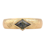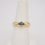 A unique piece by Kristin Novinger! This 14k Yellow Gold ring is crafted with a classic low-dome band adorned with hand-engraved detailing. The center of the ring features a diamond-shaped natural Sapphire set in a raised bezel. The stone is set upside down, bringing an even more unique look to the gorgeous stone!