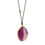 This one-of-a-kind Margaret Solow necklace is a unique gemstone lovers dream! A stunning natural Ruby slice is framed in 18k Yellow Gold, allowing the light to pass through the stone and show off it's unique characteristics. The gem pendant hangs from Margaret's signature brown Nylon Cord which features a single 14k Yellow Gold nugget accent. Bold and beautiful!