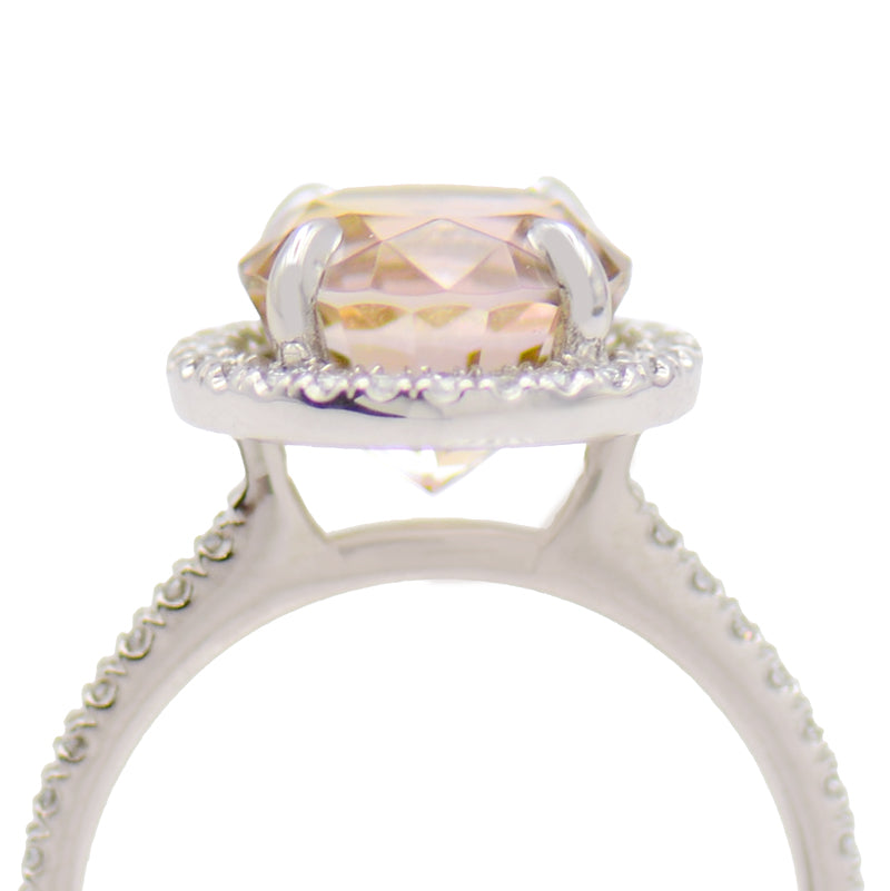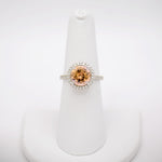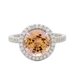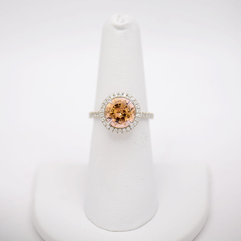 This one-of-a-kind ring will take your breath away! A 14k white gold ring features a round, faceted Autumn Tourmaline prong-set and surrounded by a halo of round brilliant cut diamonds. The diamonds lead down to the band, continuing halfway around. Kristin designed this piece to allow light to pass through the gemstone, showing off the incredibly unique pinks/oranges/yellows that this Tourmaline has to offer!