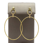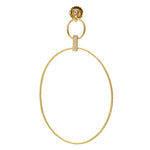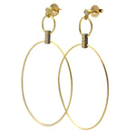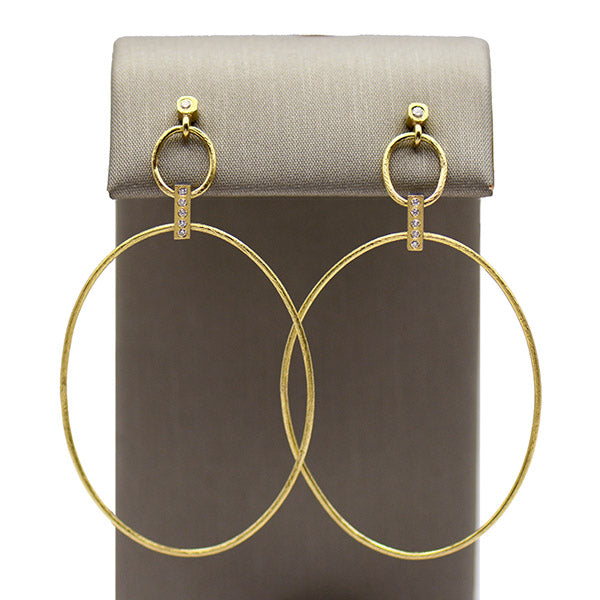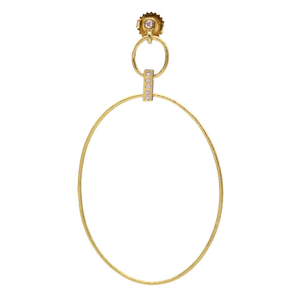 Rene Escobar has given us a new favorite pair of earrings! These 18k Yellow Gold earrings each feature a single, large open oval hoop that hangs from a smaller open circle drop. The two shapes are connected by a rectangle of Oxidized Sterling Silver flush set with 5 round diamonds that brings a touch of gorgeous sparkle! Finished off with a classic post/nut backing that features a bezel-set diamond that sits perfectly on the ear lobe.
