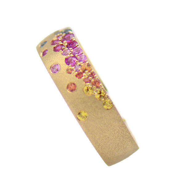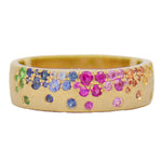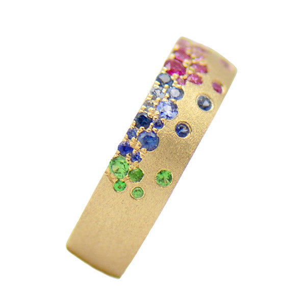 One of the pieces that made us fall in love with Dilamani! This 14k Yellow Gold ring features a mix of Sapphires and Tsavorites in a rainbow of color! The round stones are flush set in a scattered pattern that Dilamani refers to as their "confetti" collection. Finished off with a satin finish that brings a unique softness. Truly a gorgeous ring on any finger!