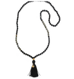 Beyond the limits of our earthly existence, our souls soar to infinite heights, where dreams dance among the twinkling stars. 108 beads of black onyx and labradorite—stones of endurance and imagination—form this mala, or ancient prayer necklace. A hand-tied silk tassel dangles from the end, accented by a golden crescent moon and star, symbols of the goddess and guidance. Wear this meaningful style as a necklace, or use it as a part of your meditation practice.