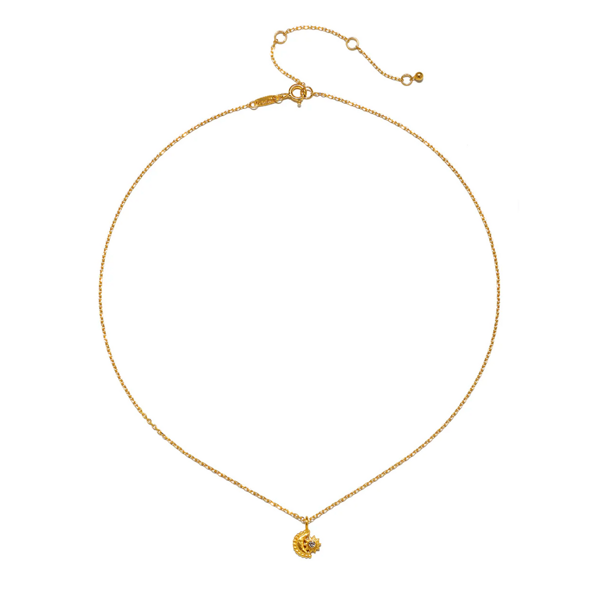As the North Star guides you closer to your dreams, the goddess moon cradles you in her protective embrace. An 18kt gold-plated necklace with a crescent moon, symbolizing the goddess and protection, cradles a star of white topaz, stone of clarity. Wear this necklace to manifest your dreams, and to light your sacred path.
