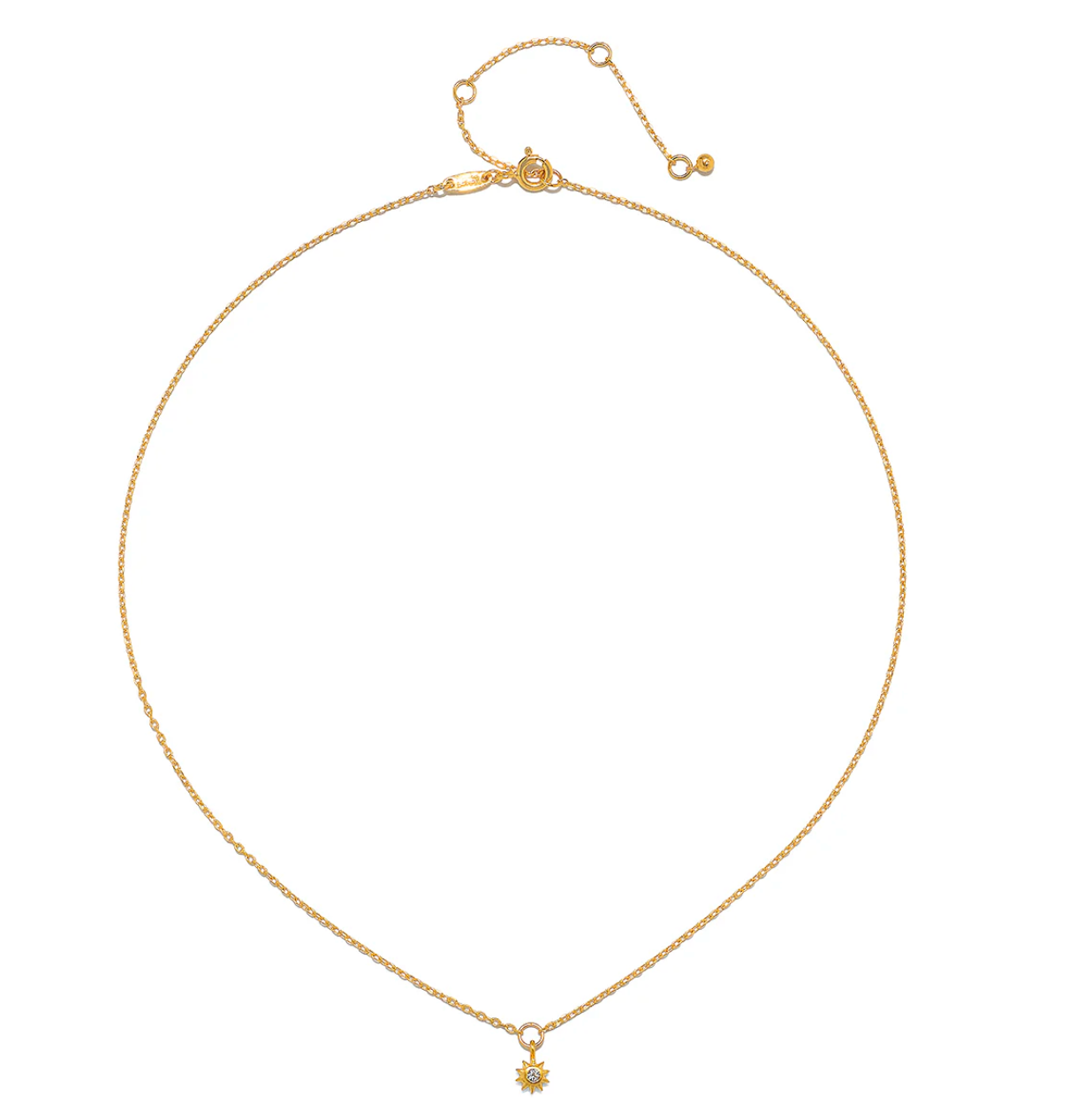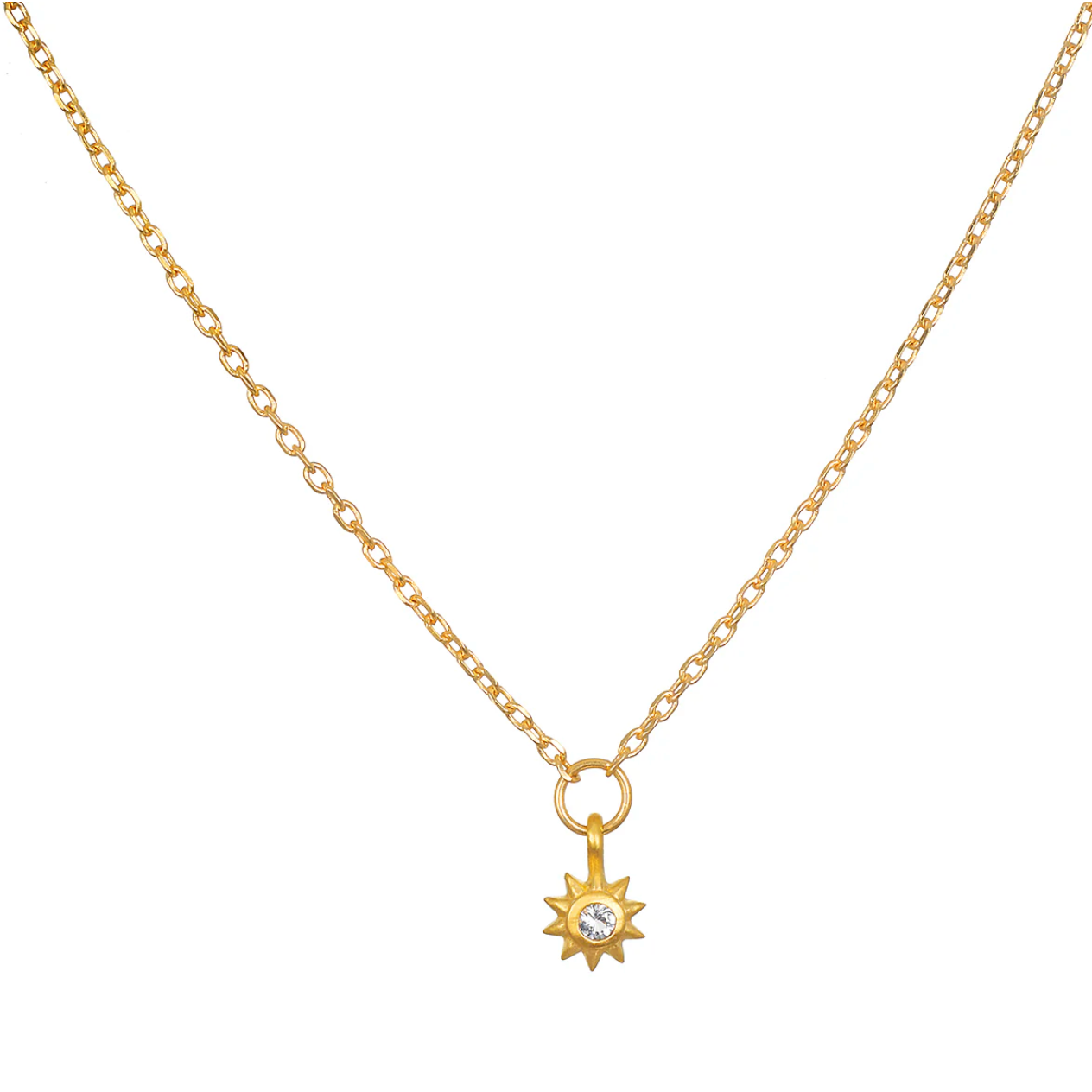 Your spirit is as bright as the sun; your beauty emanates from within. A delicate 18KT gold plate miniature sun pendant shines with a white topaz accent, stone of individuality, creativity, and awareness—an uplifting reminder that your individual light can illuminate the world around you.