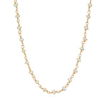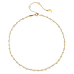 Scatter your light wherever there is darkness; share your unparalleled radiance with the Universe. Luminous pearls—stone of innocence, beauty and foresight—dance along a delicate and adjustable gold choker necklace; a crescent moon dangles from the clasp for a necklace that reveals its beauty from every angle.