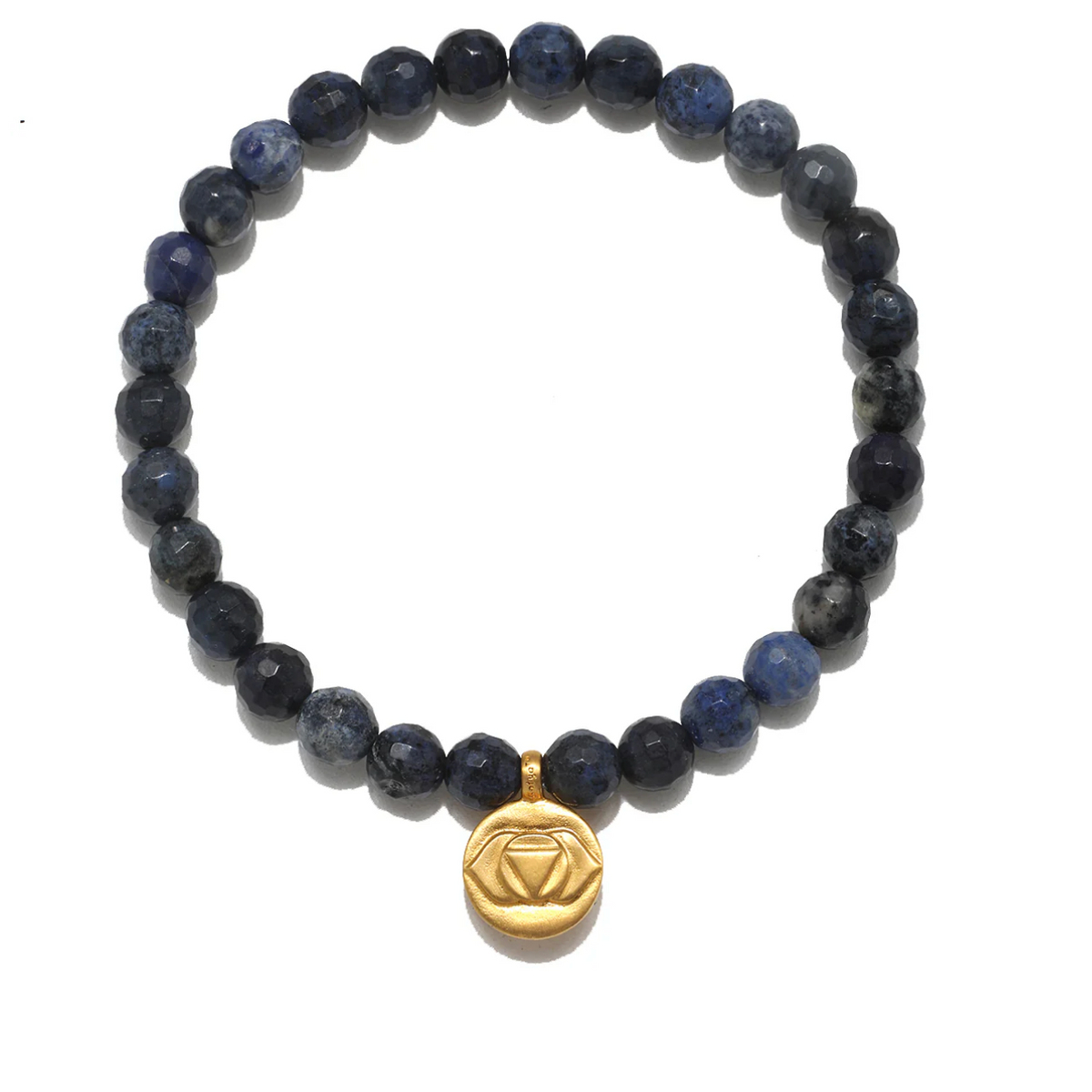 Honor your innate knowing and ignite your imagination. This healing gemstone stretch bracelet of dumortierite—stone of spirituality, consciousness, and inspiration—helps support the third eye chakra, a sacred energy center in the body that rules intuition, imagination, and vision. An 18kt gold plated charm is engraved with the symbol for the third eye chakra. When our 7 chakras are aligned and open, we move in harmony with the world, both physically and spiritually.